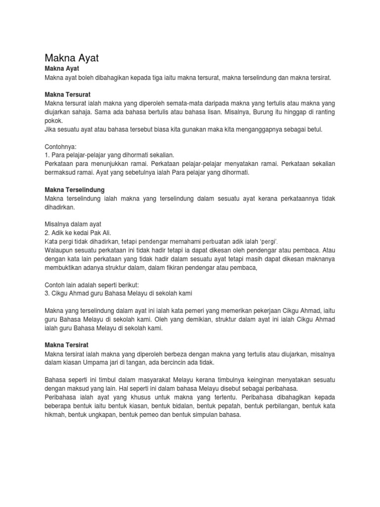 . Oke kesimpulannya meskipun kedua kalimat kata Tersirat dan Tersurat sama yaitu dengan sebuah kata-kata yang berupa lisan dan tulisan namun kedua kalimat tersebut memiliki arti yang berbeda yaitu dari segi pengungkapannya. Pasalnya makna dalam suatu bacaan terbagi menjadi dua yakni makna tersirat dan makna tersurat. -- Contoh Isi Tersurat Dan Tersirat Tahun 5 Malaykojo Available formats.